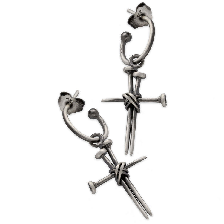 ➕ Men's hoop earring with cross made of nails, crafted from oxidized 925 silver. The 3 nails symbolize those with which Christ was crucified. A special, original, and entirely handmade piece of jewelry for men who like to make a statement with their attire. An ideal choice for a rock and carefree look.